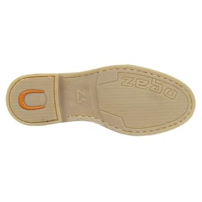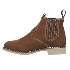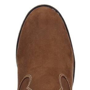 Botina masculina Zebu modelo Vira Francesa fabricada em couro na cor Marrom, possui cano curto com elásticos laterais, bico redondo, vira costurada e solado de borracha.