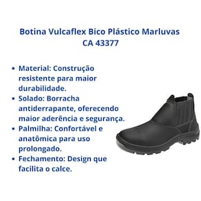 A Bota Vulcaflex Marluvas foi desenvolvida para garantir segurança, conforto e resistência no ambiente de trabalho. Sua construção em materiais de alta qualidade proporciona durabilidade, enquanto o solado antiderrapante oferece maior estabilidade em diferentes superfícies.