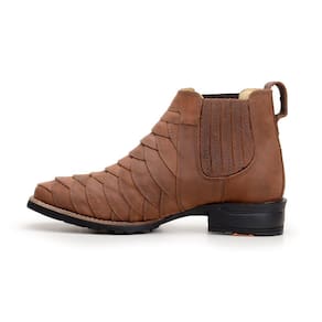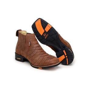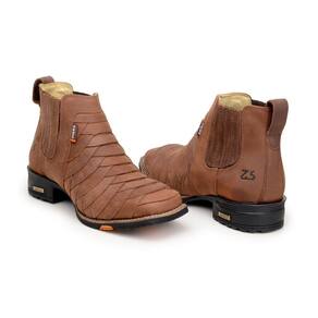 Botina Masculina Escamada Zebu, confeccionada em Couro Mustang na cor Terra. Solado em Borracha totalmente costurado , forração interna de couro, com palmilha confort de PU.
