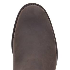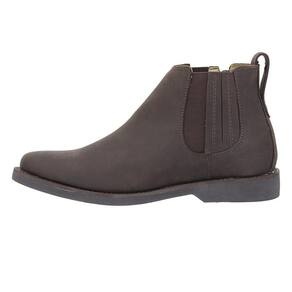 Botina masculina Zebu fabricada em couro na cor Marrom, possui cano curto com elásticos laterais e zíper, bico redondo, vira costurada e solado de borracha.
