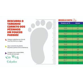Tam.: 20 > 13,5 cm Tam.: 21 > 14,5 cm Tam.: 22 > 15,0 cm Tam.: 23 > 15,7 cm Tam.: 24 > 16,0 cm Tam.: 25 > 17,0 cm Tam.: 26 > 17,5 cm Tam.: 27 > 18,5 cm