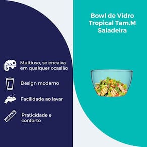 O bowl de vidro Tropical tem um design atraente e é um item muito prático para sua casa, com uma capacidade adequada às suas preparações. Fabricado em vidro super resistente, possui uma aparência delicada que garante sofisticação na decoração da sua mesa. Seja para ocasiões especiais ou para uso diário, o bowl de vidro Tropical é muito versátil para servir sobremesas, saladas ou frutas em sua casa. Também é uma excelente opção de presente para amigos ou familiares que apreciam itens elegantes e funcionais para seu lar.
