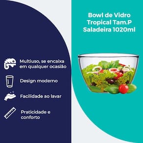 O Bowl Tropical Tam.P Saladeira de 1020ml é a escolha perfeita para servir suas saladas, frutas ou acompanhamentos com um toque de frescor e estilo. Fabricado com material de excelente qualidade esse Bowl de Vidro resistente, combina elegância e durabilidade, tornando-o ideal tanto para o uso diário quanto para ocasiões especiais.