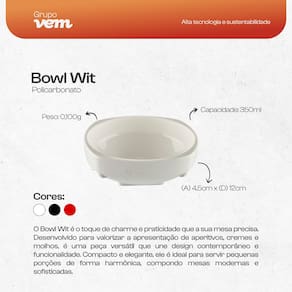 O Bowl Wit é o toque de charme e praticidade que a sua mesa precisa. Desenvolvido para valorizar a apresentação de aperitivos, cremes e molhos, é uma peça versátil que une design contemporâneo e funcionalidade. Compacto e elegante, ele é ideal para servir pequenas porções de forma harmônica, compondo mesas modernas e sofisticadas.