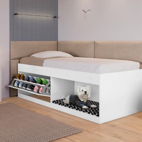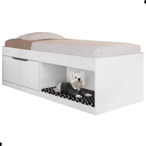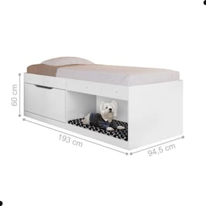A Cama Box de Solteiro é ideal para quem busca conforto, com 4 prateleiras e uma sapateira para 8 pares. Com estrutura em MDP/MDF, suporta colchões de 88x188 cm e até 130kg. A cama não acompanha colchão, mas inclui um kit pet.