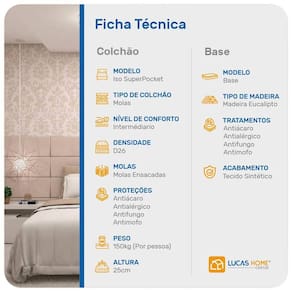 A base box é confeccionada com madeira de reflorestamento, tratamentos anticupim e antimofo. Seu revestimento de alta qualidade agrega valor e sofisticação ao quarto.