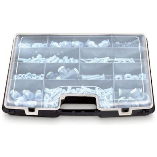 Estojo organizador master case é fabricado em material totalmente reciclado e resistente. Possui divisórias para a organização de itens menores, oferecendo praticidade e comodidade. Ideal para armazenar pequenas ferramentas manuais e itens como parafusos, buchas, aviamentos, entre outros.