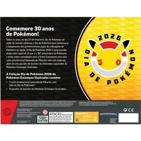 Todos os anos, no dia 27 de fevereiro, fãs de Pokémon ao redor do mundo celebram o Dia de Pokémon para comemorar o lançamento dos primeiríssimos jogos de videogame de Pokémon no Japão. O Dia de Pokémon 2026 é uma ocasião ainda mais especial, já que é o 30º aniversário da Pokémon, e estão todos convidados para a festa! Comemore com uma carta promocional laminada de Pikachu com selo especial, além de oito pacotes de booster de diferentes expansões do Pokémon Estampas Ilustradas.