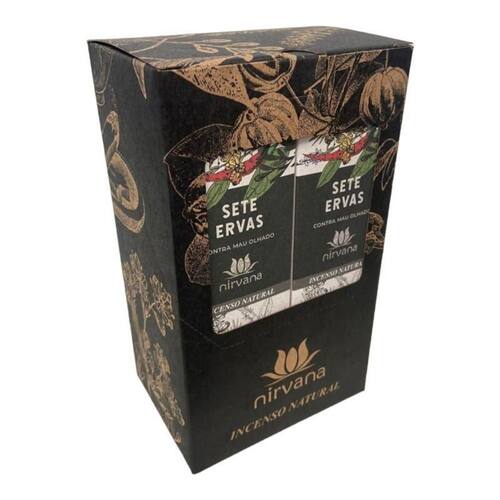 Box Incenso Nirvana Natural 12 Caixas 9 Varetas - Selecione Cor: Natural Sete Ervas Box Incenso Nirvana Natural 12 Caixas 9 Varetas - Selecionex000D x000d x000d Escolha um Aroma disponíveis na opção COR do próprio anúncio.x000d x000d Detalhes Técnico: Peso Total de cada caixa: 570 gramasx000D Quantidade Total de varetas em cada Caixa: 108 varetas aproximadamente.x000d Produto Nacional.x000d Tempo de queima aproximadamente de cada vareta 60 min.x000d x000d Enviamos o seu pedido em até 24 horas após a confirmação de pagamentox000D x000d Medidas da caixa:x000D Comprimento: 22 cmx000D Largura: 12,5 cmx000D Altura: 9,5 cmx000D x000d Composição: Varetas de bambu, carvão aditivado, resinas vegetais e ervas aromáticas.x000d x000d Caso tenha alguma dúvida nos mande mensagem que respondemos rapidinho para te ajudar da melhor forma possível Marca: Bialluz