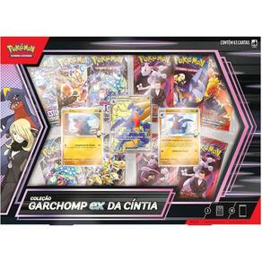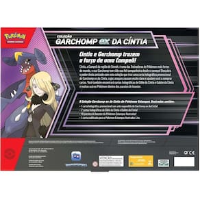 Cíntia, a Campeã da região de Sinnoh, é uma das Treinadoras de Pokémon mais fortesdo mundo, e sua Garchomp tem sido sua fiel companheira desde o começo!Descubra o poder desta amizade com esta coleção que traz uma carta holográfica promocionalde Garchomp ex da Cíntia, cujos ataques causam muito dano e ajudam você a comprarcartas. Você também encontrará cartas holográficas de Gible da Cíntia e Gabite da Cíntiae muitos outros Pokémon dentro dos pacotes de booster.