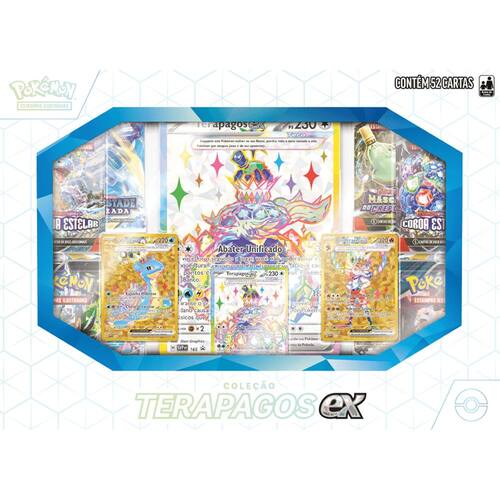 Com um casco cintilante feito exclusivamente de energia Terastal, o Pokémon Lendário Terapagos brilha intensamente em sua Forma Estelar superpoderosa! Agora, você pode adicionar esta força misteriosa aos seus bralhos do Pokémon Estampas Ilustradas com uma carta holográfica promocional de Terapagos ex. E isso não é tudo! Você ainda encontrará mais duas cartas jogáveis de Pokémon ex Tera Estelares e oito pacotes de booster que vão garantir um brilho cristalino à sua coleção. A Coleção Terapagos ex do Pokémon Estampas Ilustrada contém: • 1 carta holográfica promocional de Terapagos ex! • 1 carta holográfica promocional de Lapras ex! • 1 carta holográfica promocional de Cinderace ex!• 1 carta extragrande de Terapagos ex!• 8 pacotes de booster do Pokémon Estampas Ilustradas! • 1 carta codificada para o Pokémon Estampas Ilustradas Live.