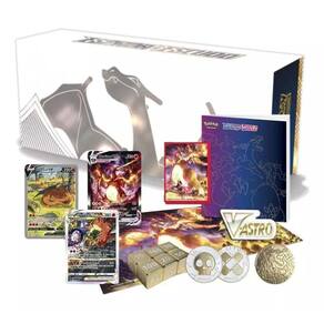 Charizard esquenta a batalha em um trio de cartas promocionais com tratamento holográfico e textura especial, e sua forma Gigamax exibe seu estilo incendiário em um tabuleiro, uma moeda de metal e um conjunto de capas para cartas. Este conjunto incrível de acessórios para jogar conta ainda com dados e marcadores de condições de metal.
