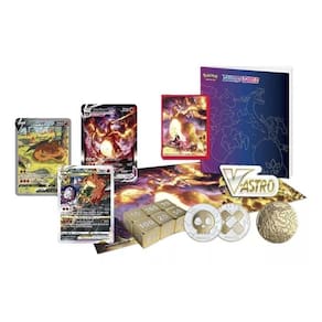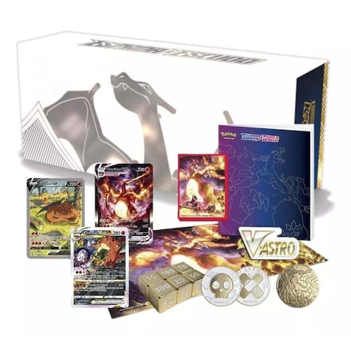 • 3 cartas holográficas promocionais com textura especial: Charizard V, Charizard VMAX e Charizard V-ASTRO!