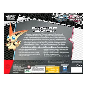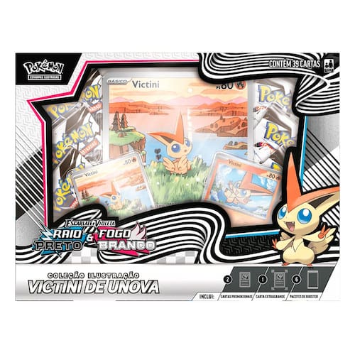Nesta coleção, você vai receber uma promocional com ilustração rara, uma carta holográfica paralela carta holográfica premium de Victini e uma carta extragrande. Você também vai encontrar ainda mais Pokémon da região de Unova nos pacotes de booster das expansões!