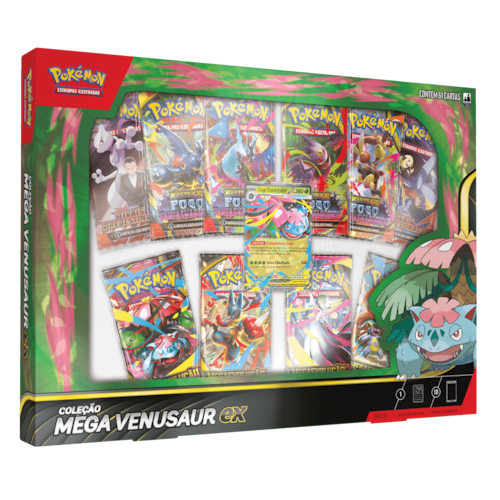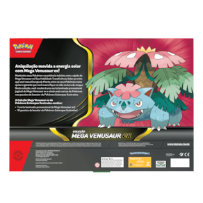 Aniquilação movida a energia solar com Mega Venusaur ex! Mantenha seus Pokémon na potência máxima com a ajuda de Mega Venusaur ex! Sua Habilidade Transferência Solar permite que você mova Energia de Planta entre os seus Pokémon como quiser e garante que você nunca fique na mão na hora do ataque. Nesta coleção, você receberá uma carta laminada promocional jogável de Mega Venusaur ex e ainda mais cartas de Pokémon nos pacotes de booster do Pokémon Estampas Ilustradas. A Coleção Mega Venusaur ex do Pokémon Estampas Ilustradas contém: • 1 carta laminada promocional de Mega Venusaur ex! • 10 pacotes de booster do Pokémon Estampas Ilustradas!