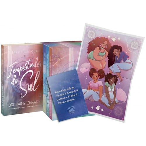 Brittainy Cherry prova que, seja qual for a direção que sua vida seguir, sempre haverá um grande amor esperando por você. Agora reunidos em um boxe exclusivo, os quatro livros da série Bússola são leituras indispensáveis para amantes de histórias rom ânticas e de superação. Tempestades do Sul (336 páginas) Tudo o que Kennedy queria era fugir. Fugir de um casamento no qual não havia mais amor nem respeito e dos fantasmas que não paravam de atormentá-la. E a pequena Havenbarrow parecia o lug ar perfeito para recomeçar sua vida. Ela só não contava que iria cair nos braços do bad boy da cidade logo de cara. E o pior: havia algo muito familiar naquele tal de Jax... Juntos, eles acabam descobrindo que são muito mais do que duas almas atormen tadas em busca de redenção. Luzes do Leste (420 páginas) Nada melhor do que uma festa para curar um coração partido. Se for Halloween então, perfeito! Lá, Aaliyah pode ser apenas Chapeuzinho Vermelho, e não a estudante que sonha em ser uma gra nde jornalista. Só que, em vez do Caçador, ela é resgatada pelo Capitão América. Juntos, os dois têm uma noite mágica e, para não quebrar o encanto ao amanhecer, resolvem não relevar seus nomes. Até que, dois anos depois, ela tem a chance de ser prom ovida, mas, para isso, precisa conseguir uma entrevista exclusiva com o solteiro mais cobiçado de Nova York — Connor Roe. Para o mundo, ele é o empresário mais bem-sucedido do momento para Aaliyah, ele é o super-herói que tocou seu coração. O ndas do Oeste (350 páginas) Depois de anos buscando pistas sobre suas origens, Damian Blackstone finalmente descobre que seu pai se chama Kevin Michaels. Ou melhor, se chamava, pois ele está morto. Kevin era dono de uma fortuna, que, de acordo com se u testamento, deve ser dividida entre Damian, seu filho biólogico, e Stella, sua filha de criação. Mas há uma condição para receberem a herança: os dois devem se casar e permanecer juntos por seis meses, senão tudo será dividido entre as três ex-espo sas de seu pai, mulheres capazes de botar a madrasta má da Cinderela no chinelo. Estrelas do Norte (378 páginas) Hailee e Aiden cresceram juntos na pequena Leeks, e, desde que deixaram as implicâncias de lado, nunca mais se desgrudaram. Os doi s sempre foram incentivadores um do outro acima de tudo, mas, quando o sentimento de amizade se torna uma paixão incontrolável, os dois têm de decidir o que é mais importante: a carreira artística de Aiden em ascensão ou viver o grande amor. C