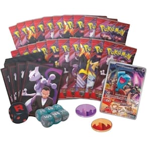 20 pacotes de booster de Escarlate e Violeta – Rivais Predestinados do Pokémon Estampas Ilustradas! 1 carta holográfica promocional com arte expandida de Wobbuffet da Equipe Rocket! 65 capas para cartas 6 dados para usar como contadores de dano! 1 dado para jogada de moeda válido para competições! 2 marcadores de condições de plástico! 1 caixa de colecionador para guardar tudo! 1 carta codificada para Pokémon Estampas Ilustradas Live.