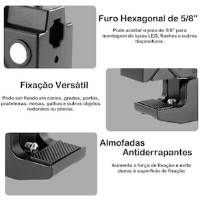 Monte uma Câmeras, Monitores, Iluminadores Leds ou outro Acessório Fotográfico em um sistema de haste com esta Braçadeira Super Clamp M01 Garra Multifuncional com Pino para Estúdio Fotográfico. Projetado para se adaptar a qualquer haste de 10 a 55mm de diâmetro ou a uma superfície plana de até 50mm de espessura, em superfícies planas use cunha de borracha removível para apertar com mais segurança; e possui capacidade de até 10kg de carga máxima.Soquete Hexagonal de EncaixeO Soquete Hexagonal de encaixe é compatível com pinos sextavados e pinos de encaixe, proporcionando uma conexão segura e sem torção para acessórios. Conecte a ponta hexagonal do pino de 5/8 na Braçadeira Super Clamp enquanto pressiona a trava de mola de liberação rápida para montagem conveniente e estável. O parafuso 5/8 é ideal para Painéis Iluminadores LED, Ring Light, Microfones, Flash de Estúdio, entre outros acessórios com o 5/8.Adaptador Pino de EspigãoEsta Braçadeira para Barra acompanha um Adaptador Pino de Espigão reversível que possui rosca de 1/4-20 em uma extremidade e um parafuso de 3/8-16 na outra extremidade, para que possa acomodar uma variedade de acessórios. Rosca de 1/4-20 e M5Para maior conveniência e versatilidade, o Super Clamp Multifuncional é equipado com roscas fêmeas de 1/4-20 e M5 para fixação de acessórios adicionais, como um Braço Magico ou um Adaptador de Cabeça, ou qualquer outro acessório que deseje usar.Cunha para Superfícies PlanasA cunha plana incluída fornece ao grampo uma superfície plana correspondente para fixação em portas, tampos de mesa ou prateleiras.Principais Características: Construção em alumínio, leve e resistente Entrada com Rosca de 1/4-20 e várias roscas M5 Pino de Espigão reversível com parafusos de 1/4-20 e 3/8-16 em cada extremidade Almofadas de borracha dentro da braçadeira prendem-na à haste e protegem seu equipamento Permite a montagem estável de câmeras, luzes, monitores e outros acessórios de até 10kg Adapta-se a qualquer haste de 10 a 55mm de diâmetro ou a uma superfície plana de até 50mm de espessura. Marca: Não Informado Ean: 0847628538870
