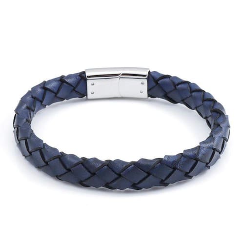 Bracelete aço 20cm couro azul trançado 10mm fecho steel