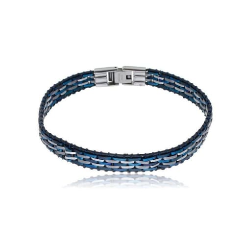Bracelete aço 21cm fita trançada azul e steel lateral couro com fio fecho steel