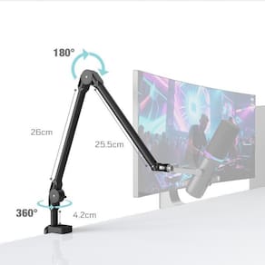 Braço articulado para microfone alumínio para podcast estúdio c1 Corpo: alumínio Compatibilidade: microfones padrão Uso: estúdio e podcast Largura máxima: 30 cm Altura máxima: 90 cm Braço articulado em alumínio para microfone - ajustável para podcast, estúdio e lives O braço articulado em alumínio para microfone oferece mobilidade, estabilidade e um visual para qualquer estação de gravação. Ideal para podcasts, estúdios, home studios, lives, streaming e locução, ele permite posicionar o microfone com precisão, mantendo a mesa organizada e livre. A construção em alumínio garante resistência e leveza, enquanto a rotação de 360 proporciona total liberdade de ajuste. A garra tipo c economiza espaço e fixa com segurança em mesas e superfícies com borda. Compatível com microfones populares como sm7b, mv7, at2020, bm800 e modelos que utilizam roscas 3/8 ou 5/8. Principais benefícios: Estrutura em alumínio leve e resistente Ajustes suaves e rotação de 360 Ocupa pouco espaço na mesa Ideal para setups de podcast, estúdio e streaming Compatível com microfones profissionais Instalação rápida e firme através da garra ajustável Especificações técnicas: Comprimento do braço superior: 25,5 cm Comprimento do braço inferior: 26 cm Abertura da garra tipo c: 1-55 mm Capacidade de carga: 1,5 kg Rosca: 3/8 com adaptador 5/8 Material: alumínio Cor: preto Marca: aj som acessórios musicais Indicado para: Podcasts e videocasts Estúdios e home studios Lives e transmissões Gravações, dublagem e locução Criadores de conteúdo, gamers e streamers Conteúdo da embalagem: 1 braço articulado em alumínio 1 garra tipo c para fixação 1 adaptador de rosca 5/8 Observação: Não acompanha microfone, shock mount ou pop filter. Marca: Não Informado