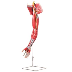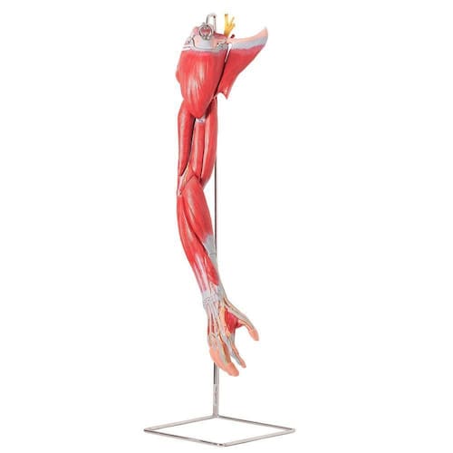 Modelo de músculos do braço, tamanho natural, com principais vasos, nervos e toda estrutura muscular. Permite ser destacado em 6 partes, com 87 pontos numerados para estudo. Confeccionado em PVC especial. Composto por: Músculos: deltoide, supraespinhoso, infraespinhoso, redondo maior e menor, subescapular, latíssimo do dorso, bíceps braquial, supinador caracobraquial, palmar, flexor dos dedos, extensor dos dedos