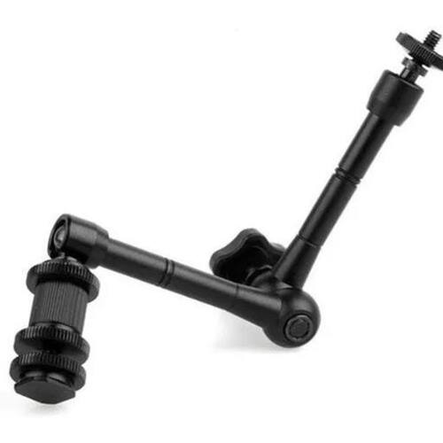 Braço articulado 11'' magic arm fancier ma-11 Braço articulado de 28 cm. Ideal para fixar iluminadores em câmeras ou filmadoras, pode ser fixado em tripés ou sliders possibilitando conseguir o ângulo de iluminação que desejar. Possui pino com rosca padrão de 1/4 em uma extremidade e furo com rosca padrão de 1/4 na outra onde é conectado um adaptador com sapata. Possui o mesmo encaixe do flash.