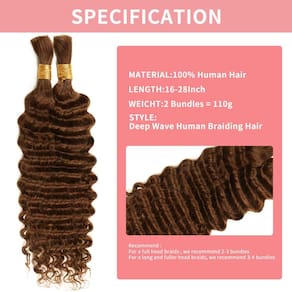 - ?Cabelo humano trançado de alta qualidade?: O cabelo humano de ondas profundas para tranças é feito de 100% cabelo humano virgem brasileiro 12A não processado. A textura do cabelo humano encaracolado para tranças boho é incrivelmente macia, natural, confortável, suave, comprimento verdadeiro, sem emaranhado, sem cheiro estranho, cheio e grosso. Nosso cabelo trançado pode naturalmente unir seu cabelo e apresentar efeitos realistas de penteado, para que você possa brilhar com confiança a qualquer hora, em qualquer lugar.