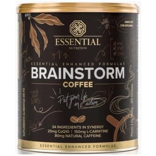 Brainstorm Coffee 186g - Sabor: Café com Especiarias Brainstorm Coffee 186g - Essential Nutrition Brainstorm Coffee reúne 34 ingredientes naturais que atuam em sinergia para ajudar nas suas atividades que pedem foco e energia, com poucas calorias por dose. É perfeito para começar o seu dia e acompanhar você naqueles momentos que pedem uma inspiração extra. Brainstorm Coffee é feito com grãos selecionados de café arábica, café robusta e café verde, o qual não passa por torrefação, preservando seus fitonutrientes. O blend de cafés com notas de cacau e especiarias traz equilíbrio e um resultado surpreendente ao paladar. Uma bebida com aroma e sabor sofisticados e um toque de cremosidade para uma experiência agradável do início ao fim. Brainstorm Coffee auxilia nos protocolos de jejum metabólico por permitir que o corpo se mantenha em estado de cetose, prologando os efeitos do jejum. Com ingredientes que auxiliam no metabolismo energético e na melhora do estado de alerta e de concentração, pode ser um grande aliado em diversos protocolos de jejum e de restrição calórica. Se você é daquelas pessoas que adora um bom café e precisa do up da cafeína para começar o dia, vai amar Brainstorm Coffee. Tem um sabor delicioso e é muito versátil. Pode ser misturado com água quente ou gelada, ou com o leite de sua preferência. Você também pode adoçar a gosto, já que sua fórmula não contém açúcar nem adoçantes. Se a intenção é tomar no pré-treino, o ideal é consumir 20 minutos antes. Benefícios: - Auxilia no funcionamento muscular, neuromuscular e no metabolismo energético;- Vitaminas do Complexo B que atuam como cofatores enzimáticos em diversas reações metabólicas;- Auxilia no metabolismo de proteínas, carboidratos e gorduras, sendo um nutriente-chave no metabolismo de macronutrientes;- Fonte 100% natural de cafeína, que auxilia no aumento do estado de alerta e na melhora da concentração;- Combinação com triglicerídeos de cadeia média que otimiza a absorção da Coq10 pelo organismo;- O café arábica possui maior complexidade de sabor e oferece uma experiência sensorial mais sofisticada;- Especiarias que favorecem o equilíbrio do corpo devido as suas diversas propriedades nutricionais.