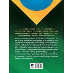 Os bastidores da série “Brasil em Constituição”, do Jornal Nacional A série “Brasil em Constituição” foi exibida no Jornal Nacional entre 29 de agosto e 28 de setembro de 2022. Em um momento em que a democracia se viu ameaçada, o objetivo era mostrar ao grande público o que a garante e a torna possível: a Constituição. Naquele momento, a ideia já era mais do que uma ação e se tornou algo ainda maior: um sentimento. Este livro é sobre isso, sobre o sentimento de urgência e a missão pela defesa da democracia; o sentimento de uma nação que tenta, por gerações, se enxergar de frente, com dificuldade e superação, garantindo os direitos e cobrando os deveres da maioria, sem esquecer as minorias. Os repórteres Pedro Bassan e Graziela Azevedo revelam os bastidores da produção e da gravação dos episódios da série, que está disponível no Globoplay. Eles compartilham com o leitor as principais conquistas garantidas pela Constituição, como as liberdades individuais, a igualdade de gênero, os direitos da população LGBTQIAPN+, a proteção aos indígenas, a liberdade religiosa e de expressão, a proteção ao meio ambiente e o direito ao voto. O livro também conta com textos de William Bonner e da produtora da série Monica Barbosa. No momento em que a chamada Constituição Cidadã completa 35 anos, o livro nos mostra como o Brasil evoluiu durante este período e como pode evoluir ainda mais. A obra é ideal para estudantes de Jornalismo e Direito, e todas as pessoas que se interessam pelos princípios constitucionais que representam a base da nossa democracia.