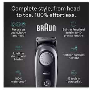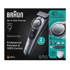 Versatilidade e precisão ilimitadas Braun Series 9 All In One é um kit de estilo 8 em 1 para versatilidade ilimitada e precisão profissional em casa. A Precision Wheel integrada apresenta 40 configurações de corte de comprimento diferentes em etapas de 0,5 mm para máxima precisão sem o incômodo de acessórios adicionais. Isso é acoplado ao ProLock para não haver erros. Lâminas e bateria de alto desempenho O ProLock liga ou desliga para travar a seleção de comprimento do ProWheel no lugar para um barbear limpo e consistente todas as vezes. Nossa lâmina ProBlade, é eficiente em cada passada, o que significa menos passadas, mesmo em áreas complicadas, para menos irritação da pele e um ótimo acabamento Tecnologia AutoSense inovadora A poderosa bateria de íons de lítio tem 180 minutos de potência de corte constante e sem fio. A inovadora tecnologia AutoSense da Braun pode ser Utilizado em cuidados com a barba, corpo e cabelo com resultados incríveis em qualquer tipo, comprimento ou espessura de cabelo. Design durável e à prova d'água O All In One Series 9 é construído para durar, em uma caixa de metal laqueada projetada para durabilidade e um ajuste perfeito na mão. O aparador e os acessórios são 100% à prova d'água e à prova de chuva suporte de carregamento com peso e um estojo de viagem para armazenamento. O pacote inclui: 1x Aparador incl. Cabeça de aparador ProBlade 1x Cabeça de aparador corporal 1x Pente de barba de precisão 0,5 mm,10 mm 1x Pente de cabelo de precisão 10,5, 20 mm 1x Cabeça de aparador de detalhes 1x Escova de limpeza 1x Suporte de carregamento 1x Estojo de viagem Bateria: Li-Ion potente Tempo de execução: 180 min sem fio Fonte: 110/220V Modelo: 9430 Certificação do inmetro: 218.037/13. Marca: Não Informado Ean: 4210201165804