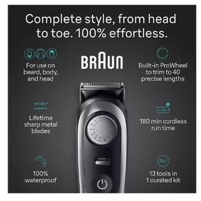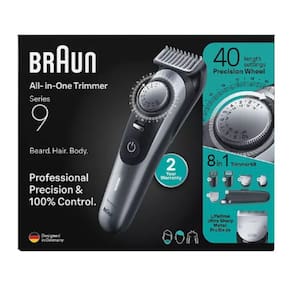 Versatilidade e precisão ilimitadas Braun Series 9 All In One é um kit de estilo 8 em 1 para versatilidade ilimitada e precisão profissional em casa. A Precision Wheel integrada apresenta 40 configurações de corte de comprimento diferentes em etapas de 0,5 mm para máxima precisão sem o incômodo de acessórios adicionais. Isso é acoplado ao ProLock para não haver erros. Lâminas e bateria de alto desempenho O ProLock liga ou desliga para travar a seleção de comprimento do ProWheel no lugar para um barbear limpo e consistente todas as vezes. Nossa lâmina ProBlade, é eficiente em cada passada, o que significa menos passadas, mesmo em áreas complicadas, para menos irritação da pele e um ótimo acabamento Tecnologia AutoSense inovadora A poderosa bateria de íons de lítio tem 180 minutos de potência de corte constante e sem fio. A inovadora tecnologia AutoSense da Braun pode ser Utilizado em cuidados com a barba, corpo e cabelo com resultados incríveis em qualquer tipo, comprimento ou espessura de cabelo. Design durável e à prova d'água O All In One Series 9 é construído para durar, em uma caixa de metal laqueada projetada para durabilidade e um ajuste perfeito na mão. O aparador e os acessórios são 100% à prova d'água e à prova de chuva suporte de carregamento com peso e um estojo de viagem para armazenamento. O pacote inclui: 1x Aparador incl. Cabeça de aparador ProBlade 1x Cabeça de aparador corporal 1x Pente de barba de precisão 0,5 mm,10 mm 1x Pente de cabelo de precisão 10,5, 20 mm 1x Cabeça de aparador de detalhes 1x Escova de limpeza 1x Suporte de carregamento 1x Estojo de viagem Bateria: Li-Ion potente Tempo de execução: 180 min sem fio Fonte: 110/220V Modelo: 9430 Certificação do inmetro: 218.037/13. Marca: Não Informado