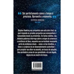 Best-seller da física que discute temas fundamentais para a sociedade contemporânea volta às livrarias em edição brochura Desde Einstein, o mundo não via um cientista tão reverenciado quanto Stephen Hawking. Com seu trabalho revolucionário em física e cosmologia, ele encantou milhões de leitores com as teorias sobre a origem do universo e a natureza dos buracos negros, além de inspirar as pessoas pela coragem e pela determinação com que lutou contra a doença do neurônio motor. Nessa reunião póstuma de seus trabalhos, de linguagem muito acessível, ele expõe seus pensamentos a respeito de questões fundamentais para o mundo. Com a racionalidade afiada de cientista e a sabedoria de uma vida permeada por desafios, o físico lança luz sobre as grandes perguntas que afligem a humanidade desde os primórdios e que ainda hoje geram profundos debates na sociedade. Somos conduzidos a reflexões como a origem do universo, a existência de Deus, a natureza do tempo e o futuro da vida na Terra. Com prefácio de Eddie Redmayne — que ganhou o Oscar por interpretar Stephen Hawking em A teoria de tudo —, introdução de Kip S. Thorne — vencedor do prêmio Nobel de Física — e posfácio comovente de Lucy Hawking, filha do autor, Breves respostas para grandes questões não é apenas a última mensagem de um grande gênio: é seu presente final para a humanidade. Um vislumbre de sua genialidade e de seu legado, dignos de um verdadeiro mestre do tempo.