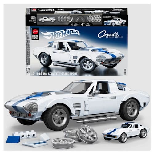 Chegou o modelo montável do Corvette Grand Sport, em escala 1:16, da Mattel Brick Shop. Este kit cheio de detalhes inclui peças extras para personalização, calotas metálicas, folha de adesivos, placa exclusiva e um carrinho metálico para colecionar. Colecione todos os modelos da linha Elite Series.