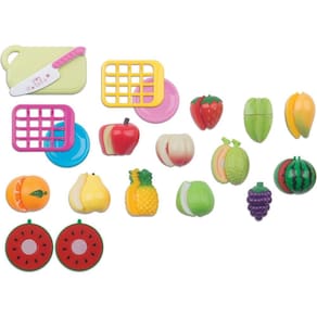 Contém 12 Frutas diferentes para "cortar", uma faca, uma tábua de corte, pratos e cestas.