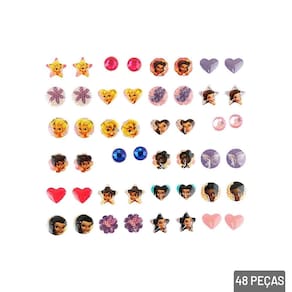 Brinco Adesivo Infantil 48 Pçs Fadas da Disn O Brinco Adesivo Infantil 24 Pares Fadas da Disney é o kit perfeito para quem adora o universo mágico das fadas! Com 24 pares de brincos, cada um inspirado nas personagens encantadoras das fadas Disney, esse conjunto oferece variedade para usar um par diferente todos os dias. Os brincos adesivos são super fáceis de aplicar, proporcionando praticidade e conforto, sem dor ou incômodo.\nIdeais para quem está começando a usar acessórios, esses brincos são perfeitos para o dia a dia ou para ocasiões especiais, como festas ou eventos temáticos. Com tantas opções encantadoras, é possível criar looks mágicos, sempre com o brilho das fadas Disney!\nEspecificações: Marca : BM COMERCI\nTipo de material : Plástico\nCores ou Estampa :\nDimensões do Produto : 14 X 12 X 0,5 CM\nDimensões da Embalagem : 14 X 12 X 0,5 CM\nPeso Bruto (Gramas) : 0.010