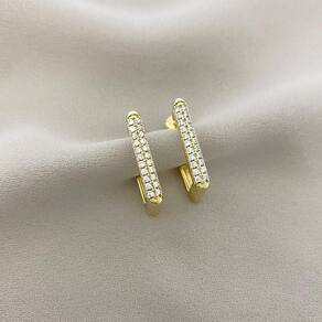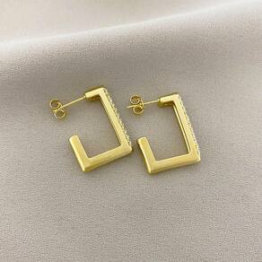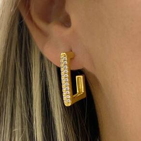 Brinco Argola Retangular Aberta Cravejada com Zircônia Banhado a Ouro