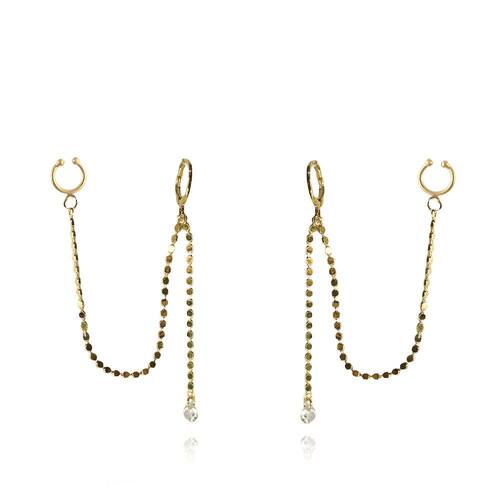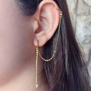 Esse brinco é composto por uma argolinha articulada e duas correntes, uma delas temos um ponto de luz e no outro um piercing fake.