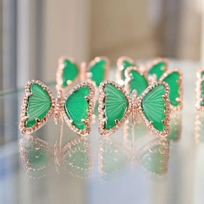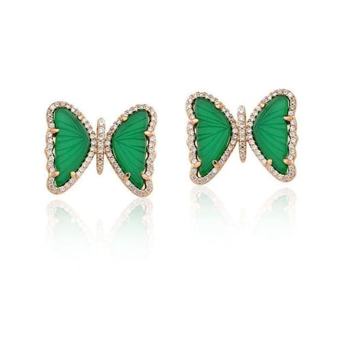 Brinco borboleta com asas de Cristais lapidados na cor Esmeralda, bordas cravejadas com Zircônias Brancas, Banhado a Ouro Rosê lindo Arrase