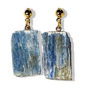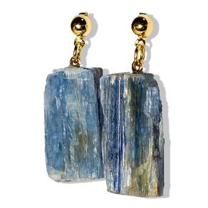 Brinco Cianita Azul Pedra Bruta Natural Montagem Tarraxa Dourado, Brinco Canudo de Cianita Azul Bruto Natural, Peça com montagem artesanal, furo com argola mais Tarraxa em Dourado.