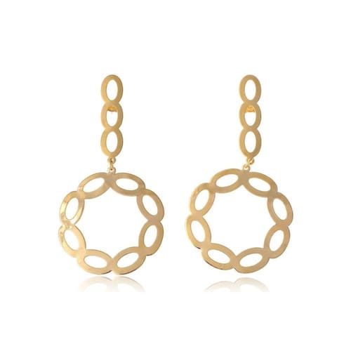 Brinco com fio e círculo com arcos folheado em ouro 18k O brinco grande com fio e círculo com arcos vazados é um acessório atemporal que se encaixa bem em qualquer ocasião e em qualquer composição. Uma peça luxuosa com um design exclusivo. Um brinco folheado em ouro 18k com uma presença marcante e única. Esse acessório é antialérgico Diâmetro: 7cm.garantia: 6 meses.