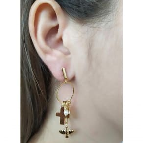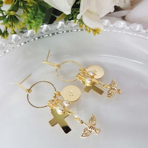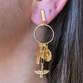 O brinco é composto por pingentes de Cruz, Espirito Santo, uma medalhinha escrita Fé e uma mini pérola folheados em ouro 18k. Um Brinco para quem ama acessórios religiosos.