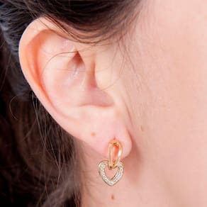 Um par de brincos com coração banhado a ouro e aplicação de microzircônias brancas . É delicado e luxuoso que te deixa em destaque em qualquer situação.