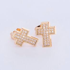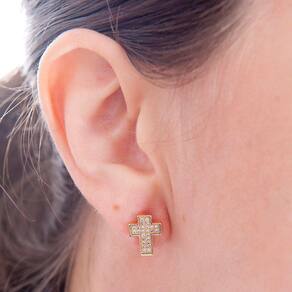 Um par de brincos em formato de cruz, banhado a ouro e cravejado de microzircônias cristal. É delicado e luxuoso lhe deixando em destaque em qualquer situação.