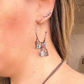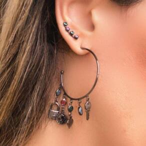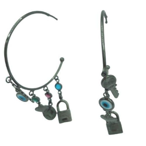 Brinco de argola com pingentes de chave, cadeado, medalinha, ponto de luz e olho grego ródio negro