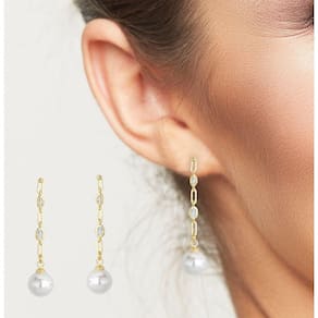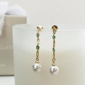 Apresentando um par de brincos delicados, adornados com pérola sintética e corrente banhada a ouro 18k. No centro da corrente, zircônias em verde, cristal e rosa proporcionam brilho sutil. Elegância clássica e sofisticação se fundem neste design versátil, perfeito para qualquer ocasião.