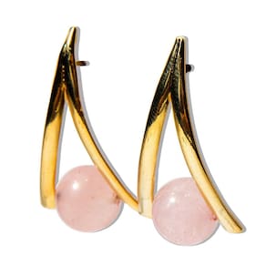 Brinco com Montagem em "V" e Pedra de Quartzo Rosa Esférica - Joia Artesanal Este elegante brinco possui uma montagem em "V" sofisticada, combinada com uma pedra esférica de Quartzo Rosa, cuidadosamente lapidada e polida de forma artesanal. A peça é banhada em dourado para um acabamento refinado, conferindo brilho e durabilidade. Características:\nPedra Principal: Quartzo Rosa Cor da Pedra: Rosa suave Corte da Pedra: Esférico Claridade da Pedra: Transparente com brilho vítreo Tamanho da Pedra: 10 mm de diâmetro Dimensões do Brinco: 33 x 16 mm Peso Total da Joia: 10 quilates Metal: Base niquelada em dourado Origem: Curvelo, MG (Brasil) Montagem: Totalmente artesanal, com polimento feito em máquina de vibração para acabamento impecável\nFoto meramente ilustrativa. Este brinco artesanal é uma excelente escolha para quem busca sofisticação, qualidade e estilo atemporal. Marca: CristaisdeCurvelo