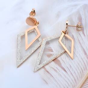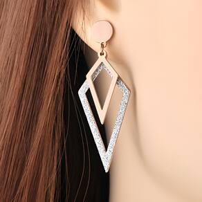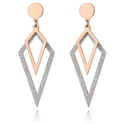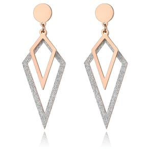 Esses brincos apresentam um design geométrico moderno e sofisticado. Eles são formados por dois losangos sobrepostos, um interno e outro externo. O losango interno tem um acabamento liso e brilhante em tom de rosé, enquanto o externo tem uma textura brilhante prateada, adicionando contraste e brilho ao conjunto.