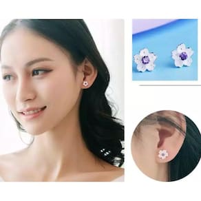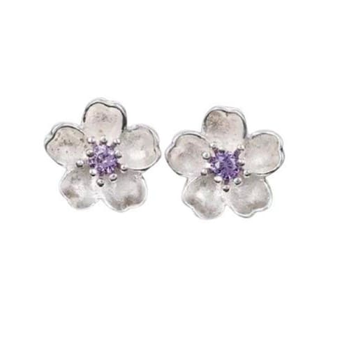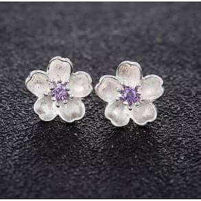 Brinco Flor Prateado Branco Detalhes Pedra Roxa