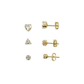 descrição do produto brinco banhado a ouro 18k trio de brincos solitários 3 furos de zircônias. Uma linda peça composta por uma três brincos: 1, 2 e 3 furos. O maior sendo um coração de zircônia, o médio um triângulo de zircônia, e o menor uma zircônia redonda. Semijoia leve e confortável para uso diário. Faça a combinação que preferir ou use de forma unitária. Conjunto kit muito versátil. O que oferecemos um banho de ouro 18k, com qualidade , cor e tonalidade idênticas ao de uma peça de ouro 18k. Embalagem caixa acrílica de luxo para você guardar sua semijoia e mantê-la brilhante por muito tempo. É bijuteria ou semijoia todas nossas peças são semijoias, ou seja a deposição de ouro sobre o metal pode ser até 250 vezes maior que a quantidade de ouro 18k depositada em uma peça de bijuteria. Portanto o que nós oferecemos é qualidade. As semijoias dão alergia não, nossos produtos são níquel free, cádmio free e cinza free, todos esses compostos químicos são alérgicos e estão fora de nosso processo de produção. Tem garantia sim , 6 meses mediante apresentação do certificado de garantia.